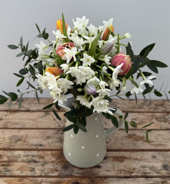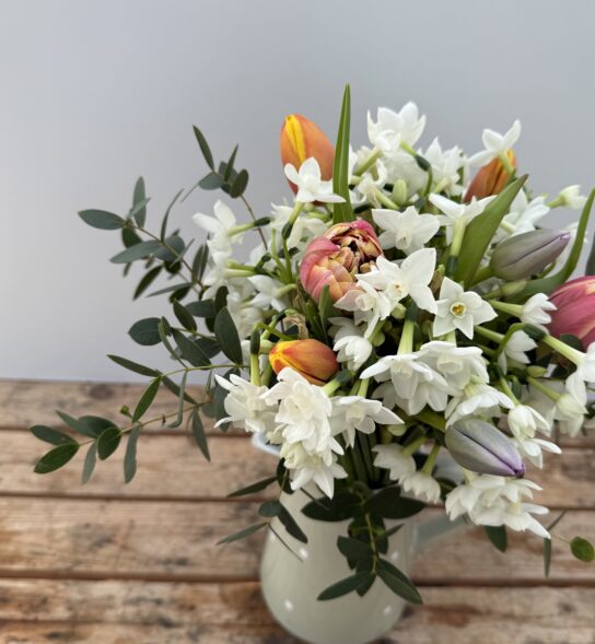 This gorgeous bunch will have 30 stems of white highly Scented Narcissi, 7 stems of mixed colour Tulips and some lovely fresh foliage.