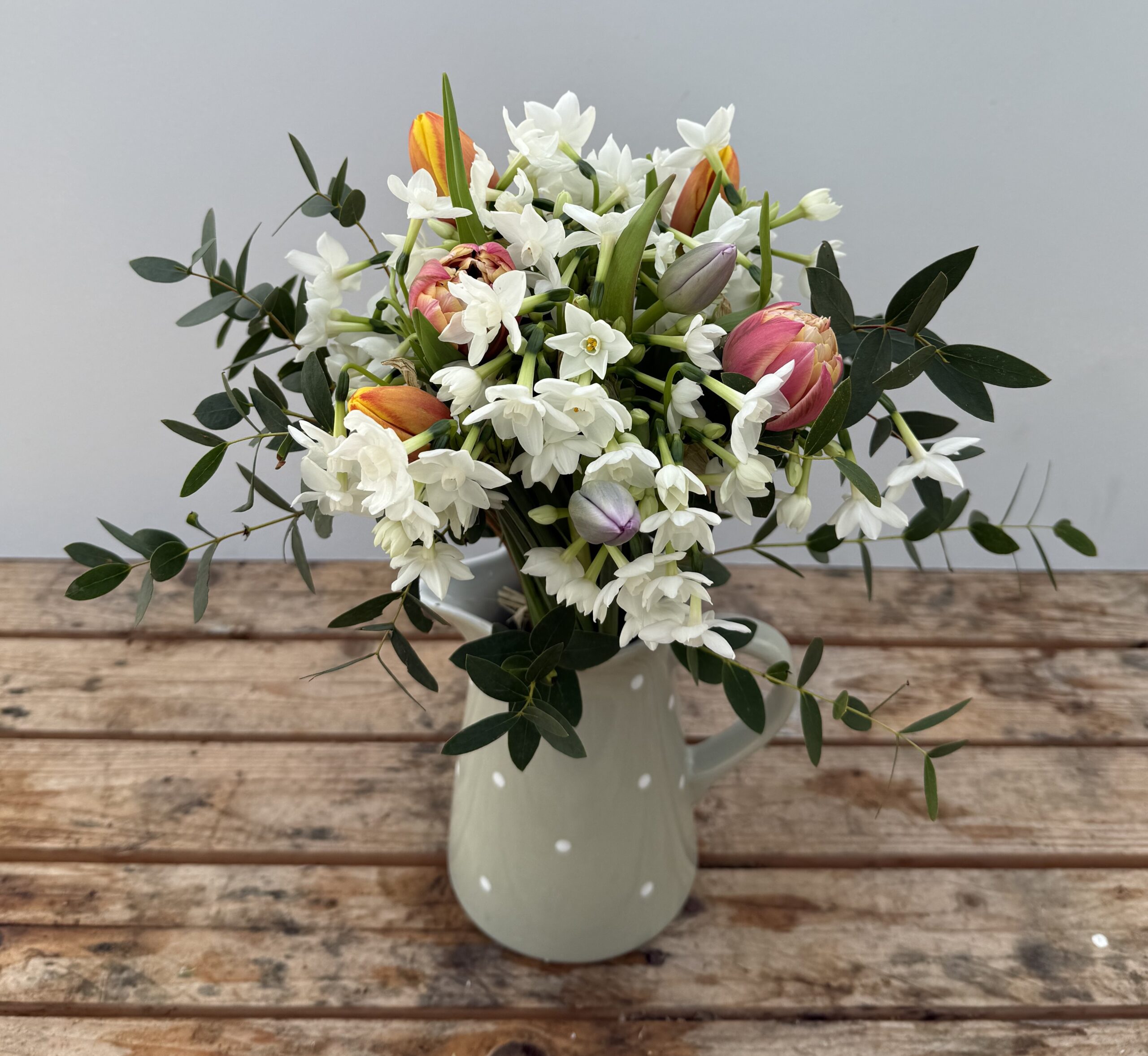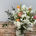 This gorgeous bunch will have 30 stems of white highly Scented Narcissi, 7 stems of mixed colour Tulips and some lovely fresh foliage.