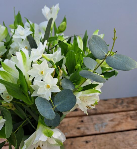 The bouquet will have 20 stems of beautiful white Scented Narcissi and 8 stems of white Alstroemeria.