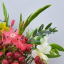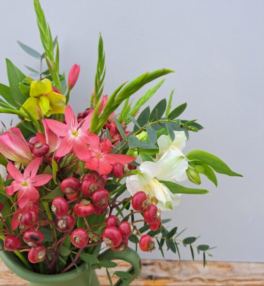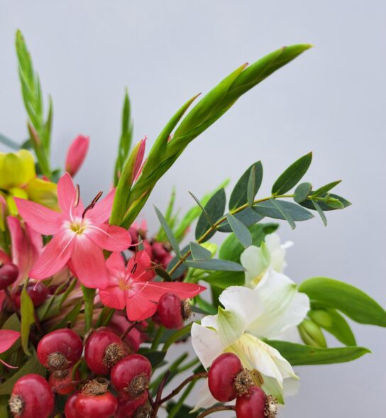 The Alstroemeria will be in mixed colours, the River Lily open up to reveal beautiful corally pink star shaped flowers and the Rosehips will bring some beautiful autumnal charm to the bouquet.