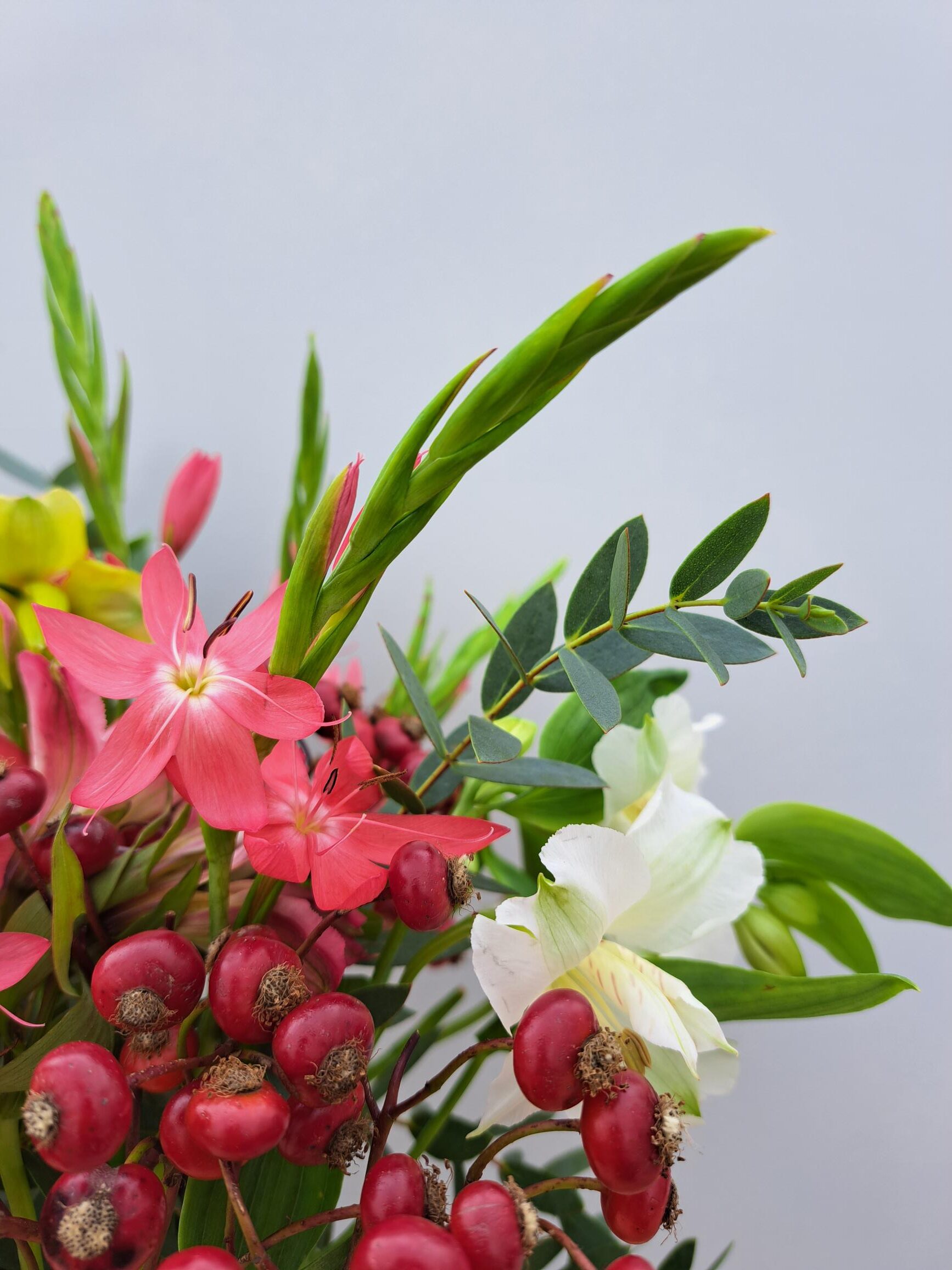 The Alstroemeria will be in mixed colours, the River Lily open up to reveal beautiful corally pink star shaped flowers and the Rosehips will bring some beautiful autumnal charm to the bouquet.