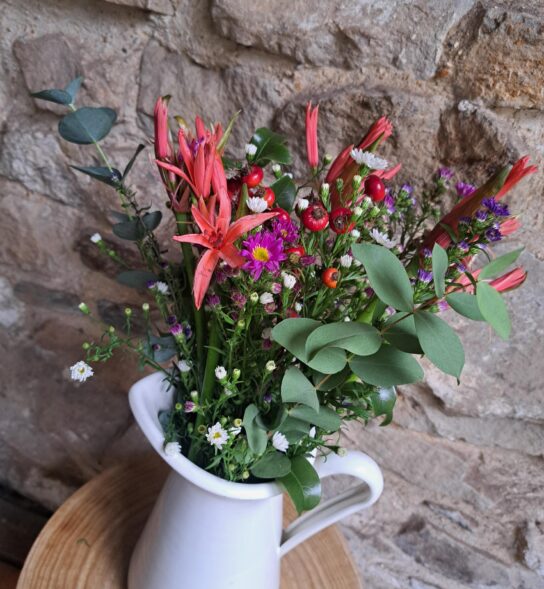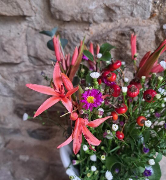 This weeks Bouquet of the Week is a beautiful mixture of Cornish Nerines, Michaelmas Daisies, Rosehips and lovely fresh foliage.