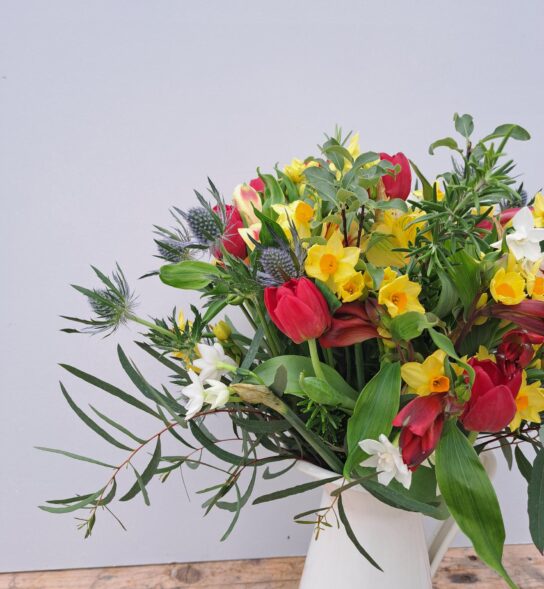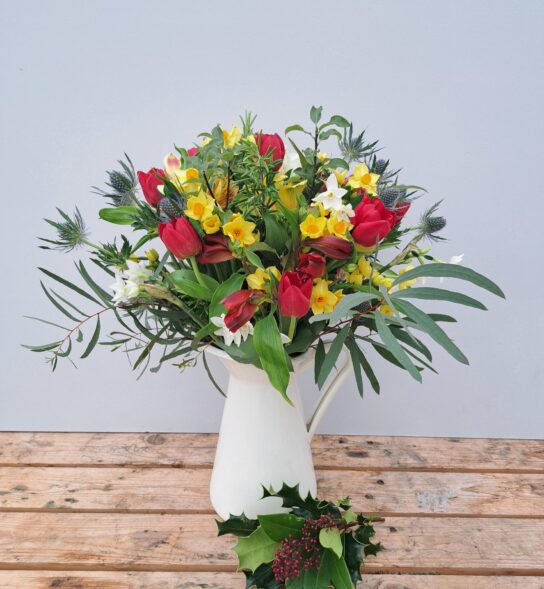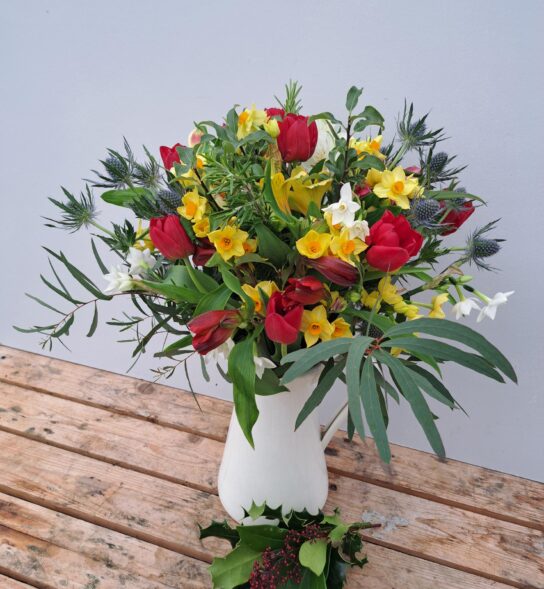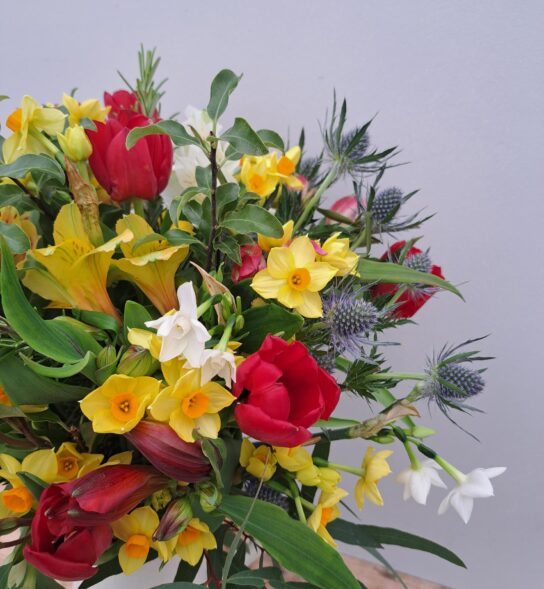The posy is likely to include Cornish Alstroemeria, Cornish Daffodils, Cornish Narcissi, British Tulips, British Eryngium and Cornish Foliage.
