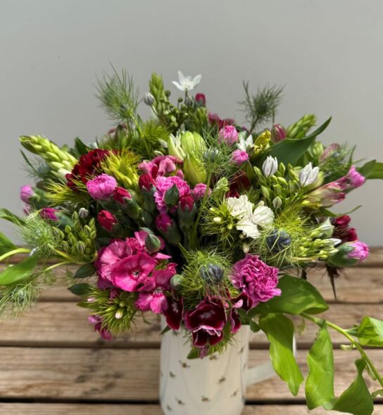 The posy in November/December will include a selection from Cornish Scented Pinks, Scented Narcissi, Alstroemeria, Nerines, Tulips, Chrysanthemums, River Lily and fresh foliage.