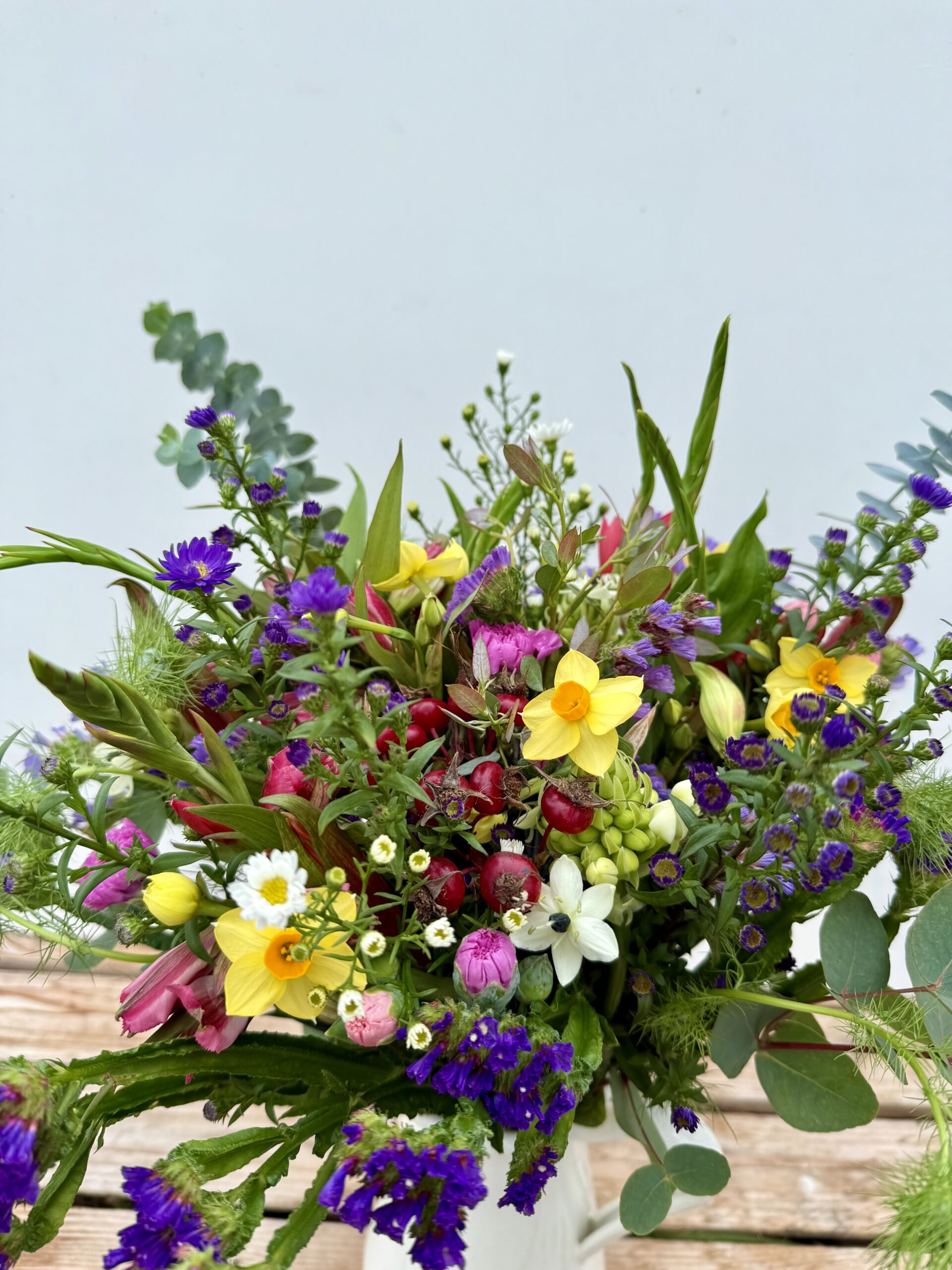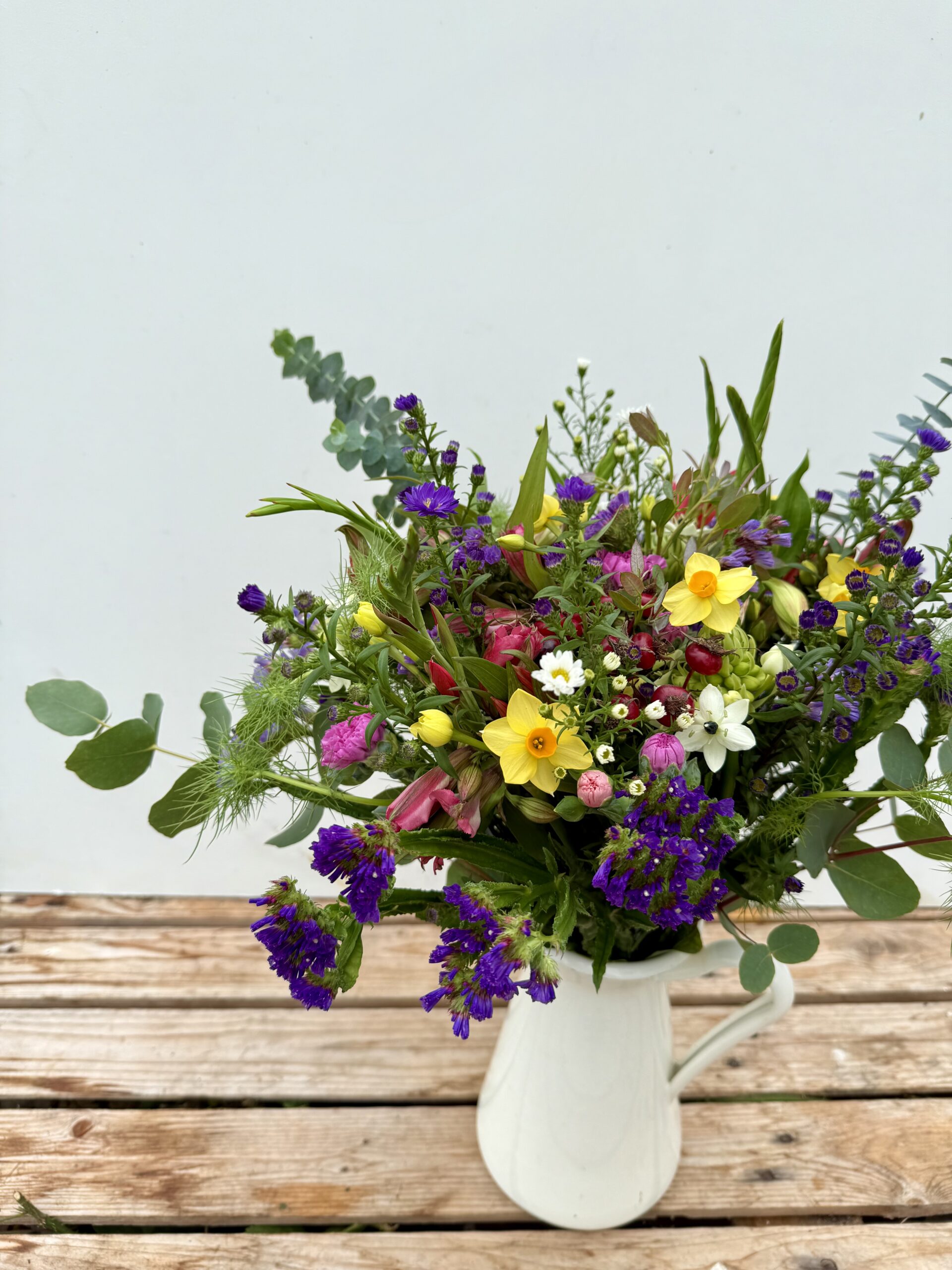 The posy in October will include a selection from Scented Pinks, Scented Narcissi, Snapdragons, Alstroemeria, Scabious, Statice, Nigella, Sunflowers, Helichrysum, Zinnia, River Lilies, Michaelmas Daisies and some of our lovely farm grown foliage where available.