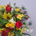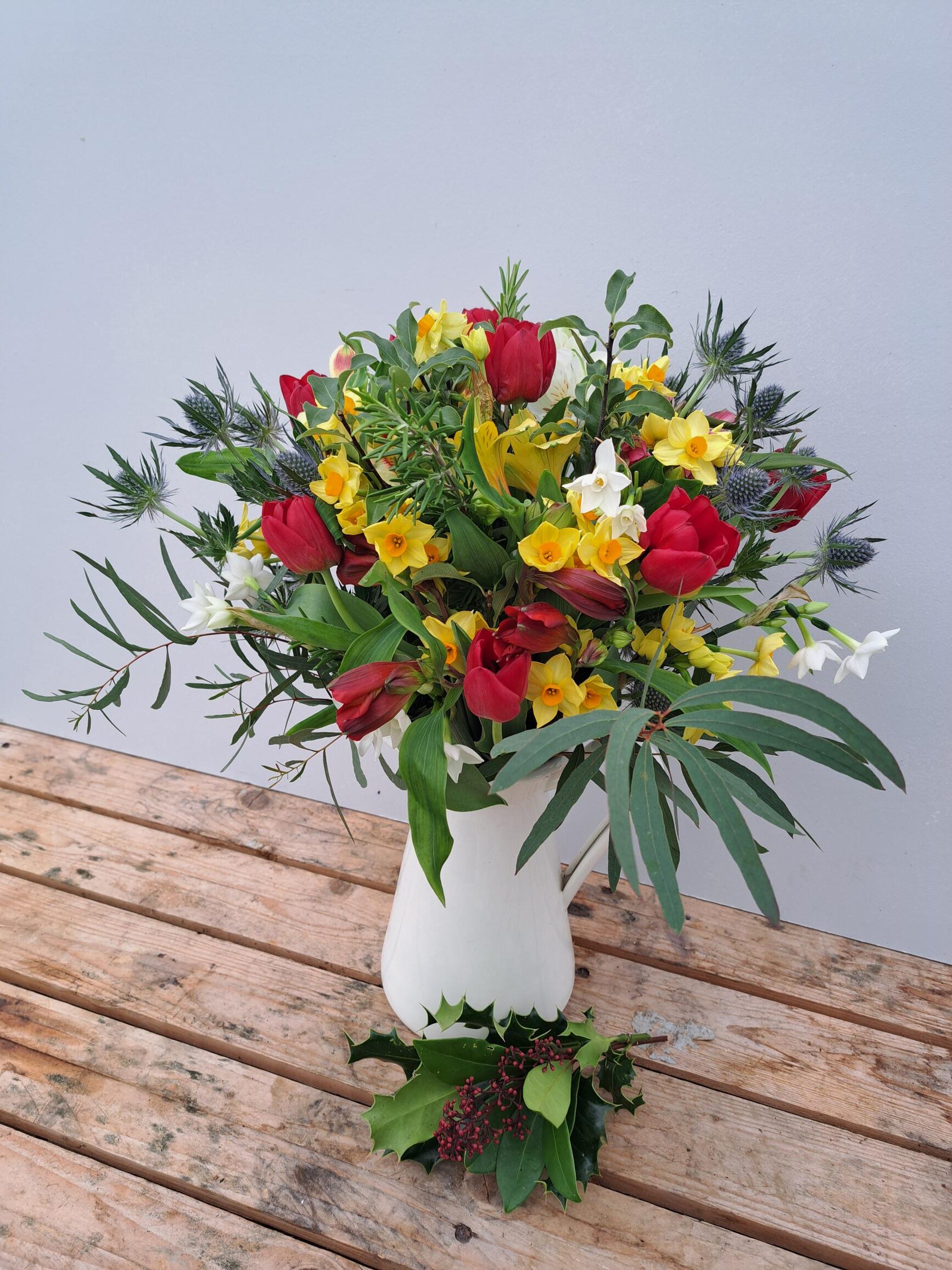 The posy is likely to include Cornish Alstroemeria, Cornish Daffodils, Cornish Narcissi, British Tulips, British Eryngium and Cornish Foliage.